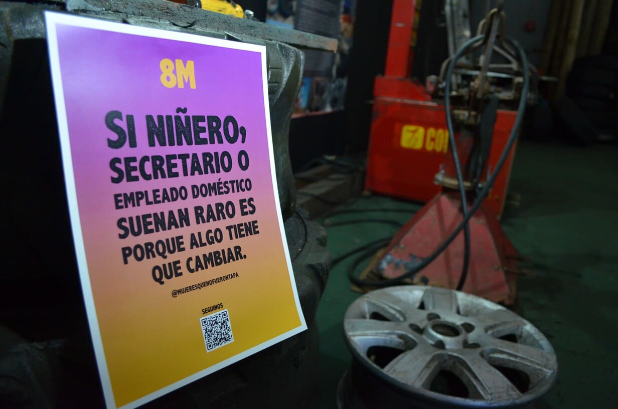 En esta jornada hablamos sobre la historia del 8M, hablamos sobre preconceptos naturalizados, intervinimos con cartelería el aula, el taller y otros espacios del centro de formación, hablamos sobre derechos e igualdad ante los mismos, sobre prácticas cotidianas machistas, relaciones de poder y opresión, y comenzamos a trabajar en un protocolo guía con formas de promover la transformación de las gomerías/talleres en lugares con mejores condiciones para las compañeras.